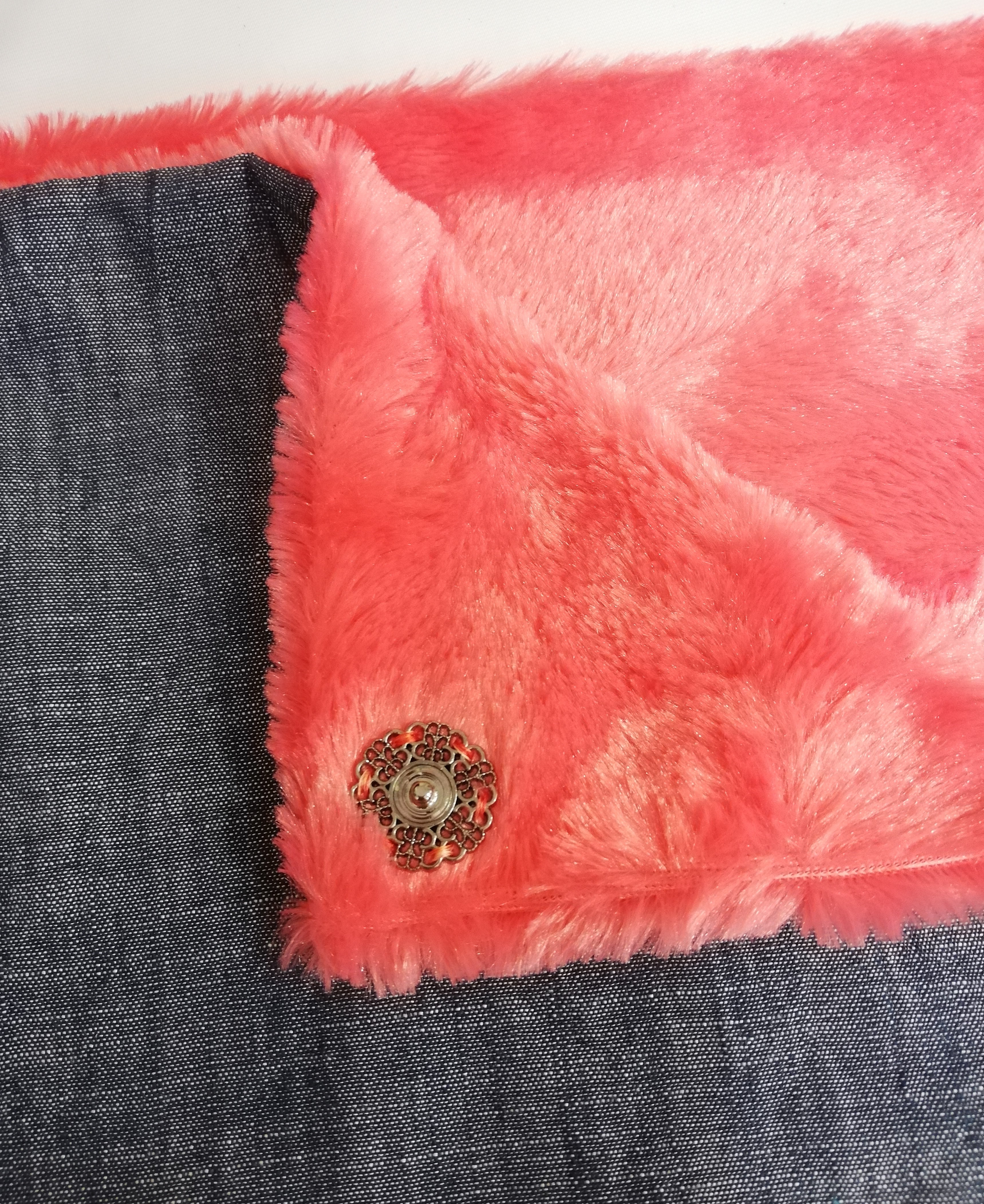 Je vous propose un tour de cou écharpe à attacher par un seul bouton. Il a pour avantage de se passer sans risque de vous décoiffer (on a toutes fait l’expérience du snood qui vous aplati les cheveux ou au contraire vous met plein d’électricité.